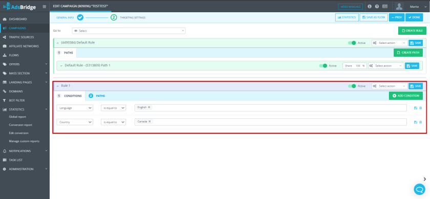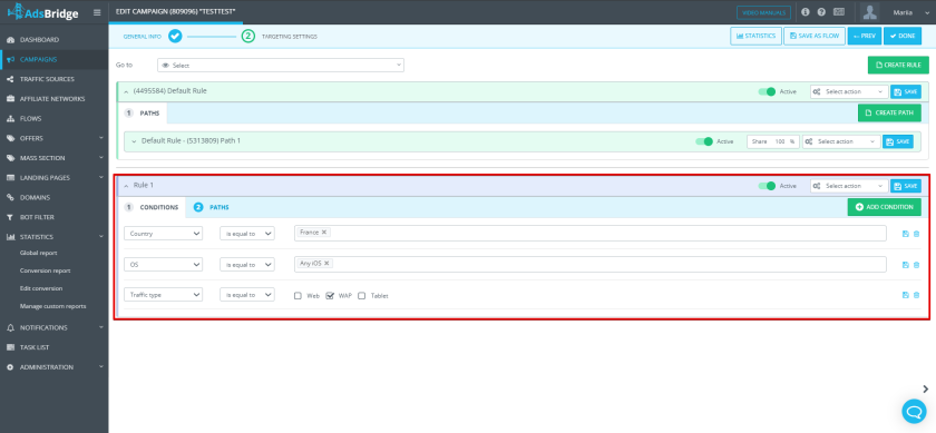 - Condition – where you define traffic parameters;
